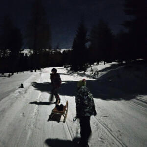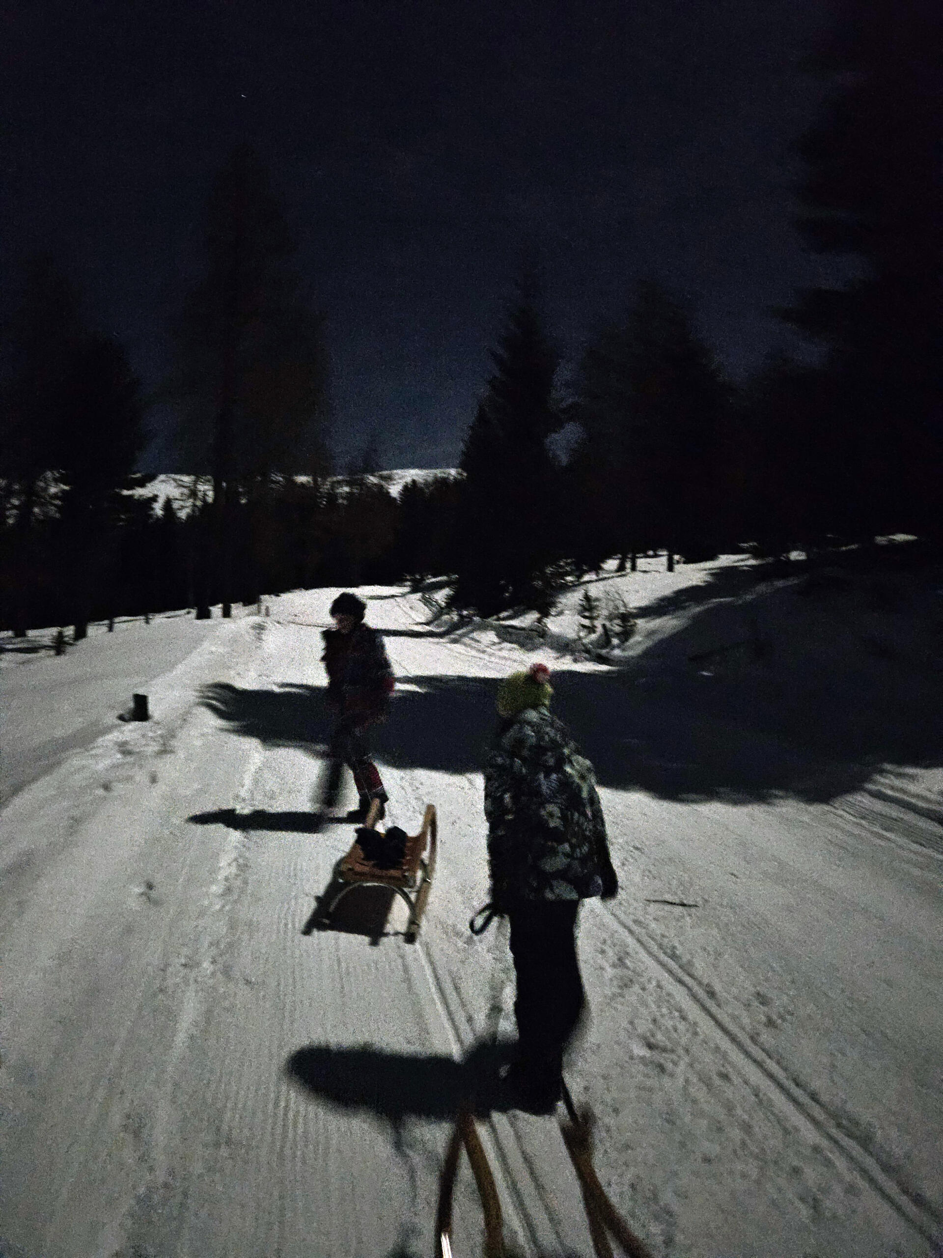 Schneebedeckte Hänge, eine Rodel fängt die pure Winterfreude ein: Stille, klare Luft und das kindliche Kichern bei der rasanten Abfahrt verbinden Natur und Genuss in einem Augenblick.